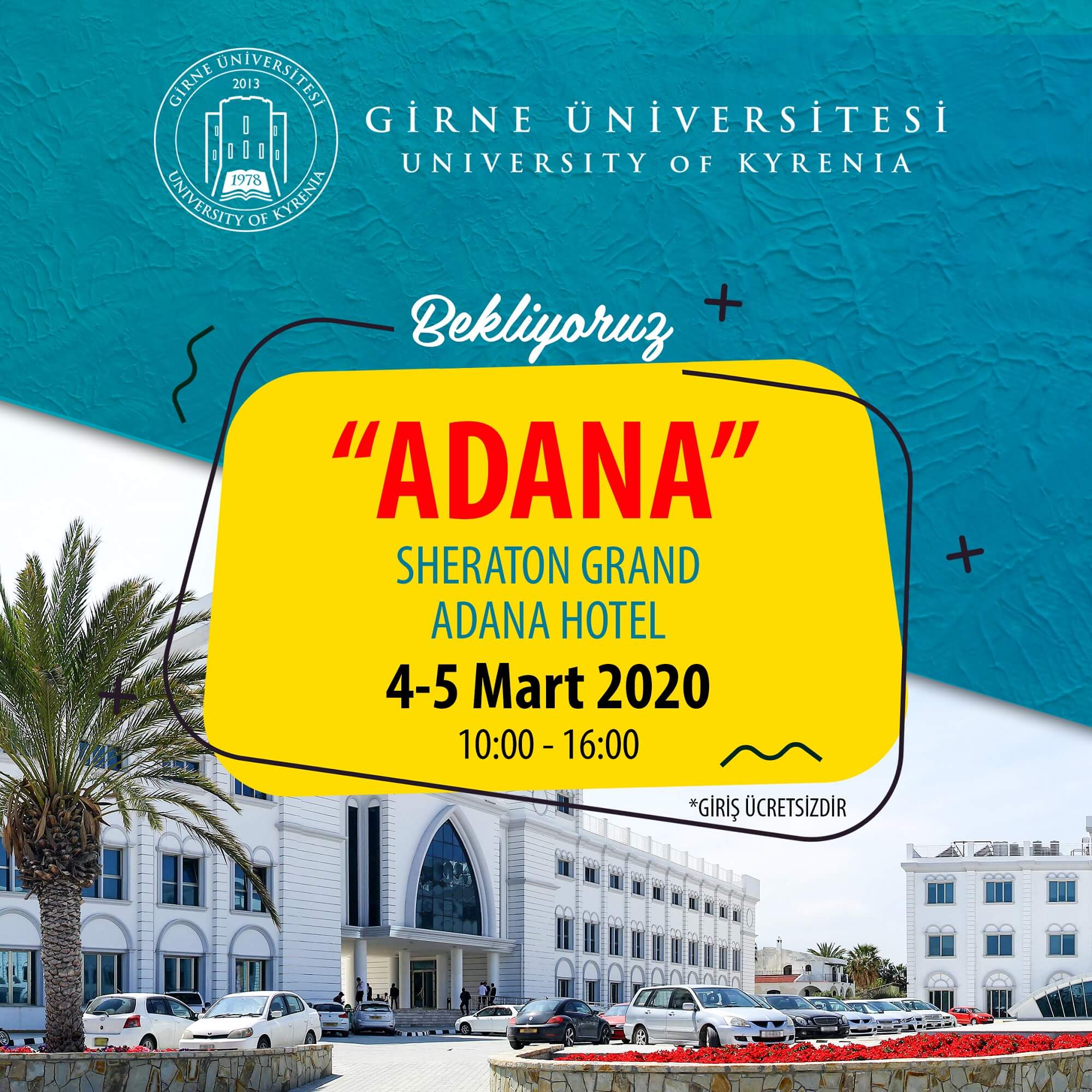 Eklenme Tarihi: 02 Mart 2020, 13:47 Paylaş: Girne Üniversitesi ile ilgili tüm sorularınızı ve merak ettiklerinizi temsilcilerimize ve okul yetkililerimize sorabilirsiniz. ”Yeni Ufuklara” yol almak için sizi 4-5 Mart Çarşamba ve Perşembe günü Sheraton Grand Adana Hotel’e bekliyoruz.