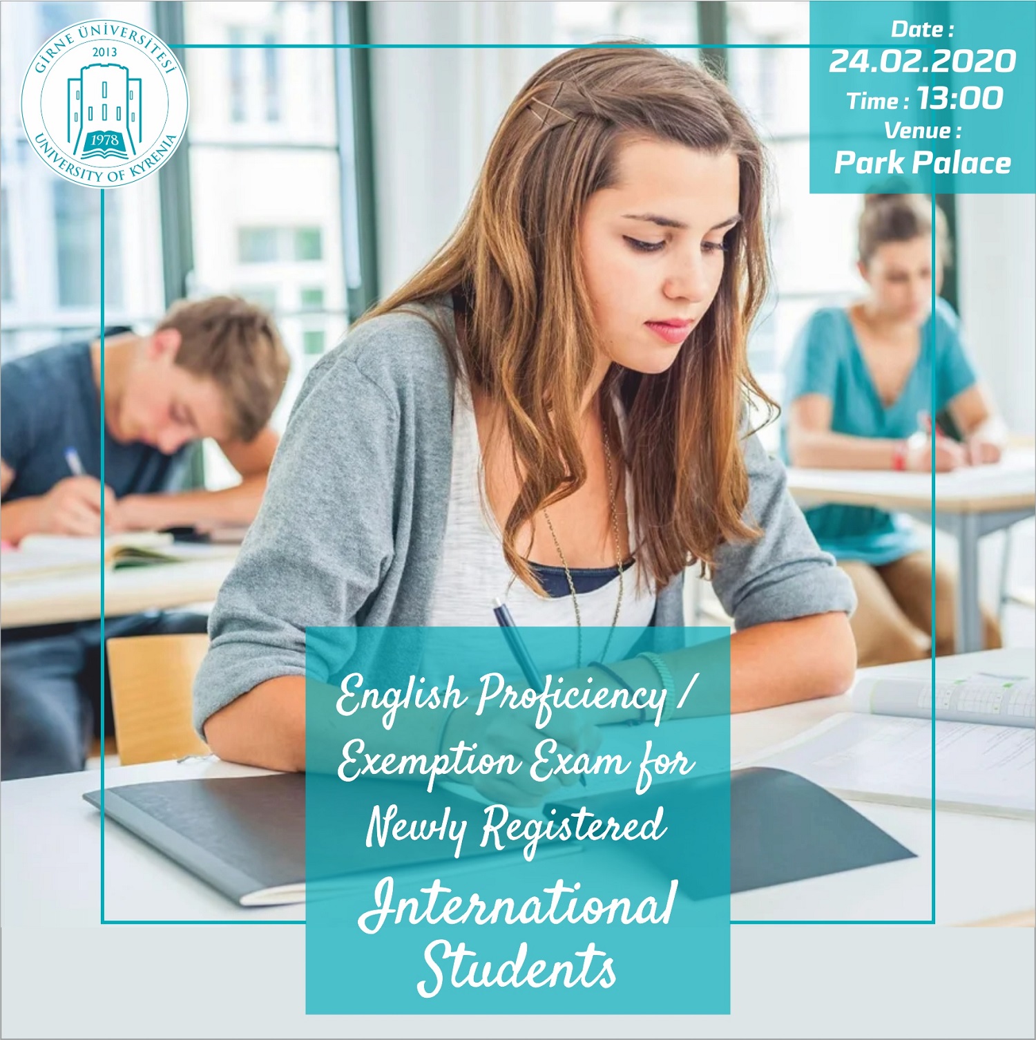 English Proficiency / Exemption Exam for Newly Registered International Students will be held on the 24th of February 2020 at Park Palace at 13:00.