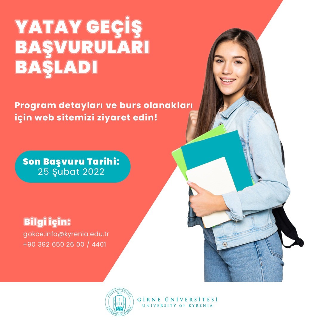 Girne Üniversitesi’ne yatay geçiş yapmak isteyen öğrenciler 25 Şubat tarihine kadar başvuru yapılabilecek. Yatay geçiş başvuru koşulları ile özel burs imkanları hakkında detaylı bilgiye aday.kyrenia.edu.tr web sayfasından, gokce.info@kyrenia.edu.tr adresinden veya +90 392 650 26 00 no’lu (dahili 4401) telefondan ulaşmak mümkün.