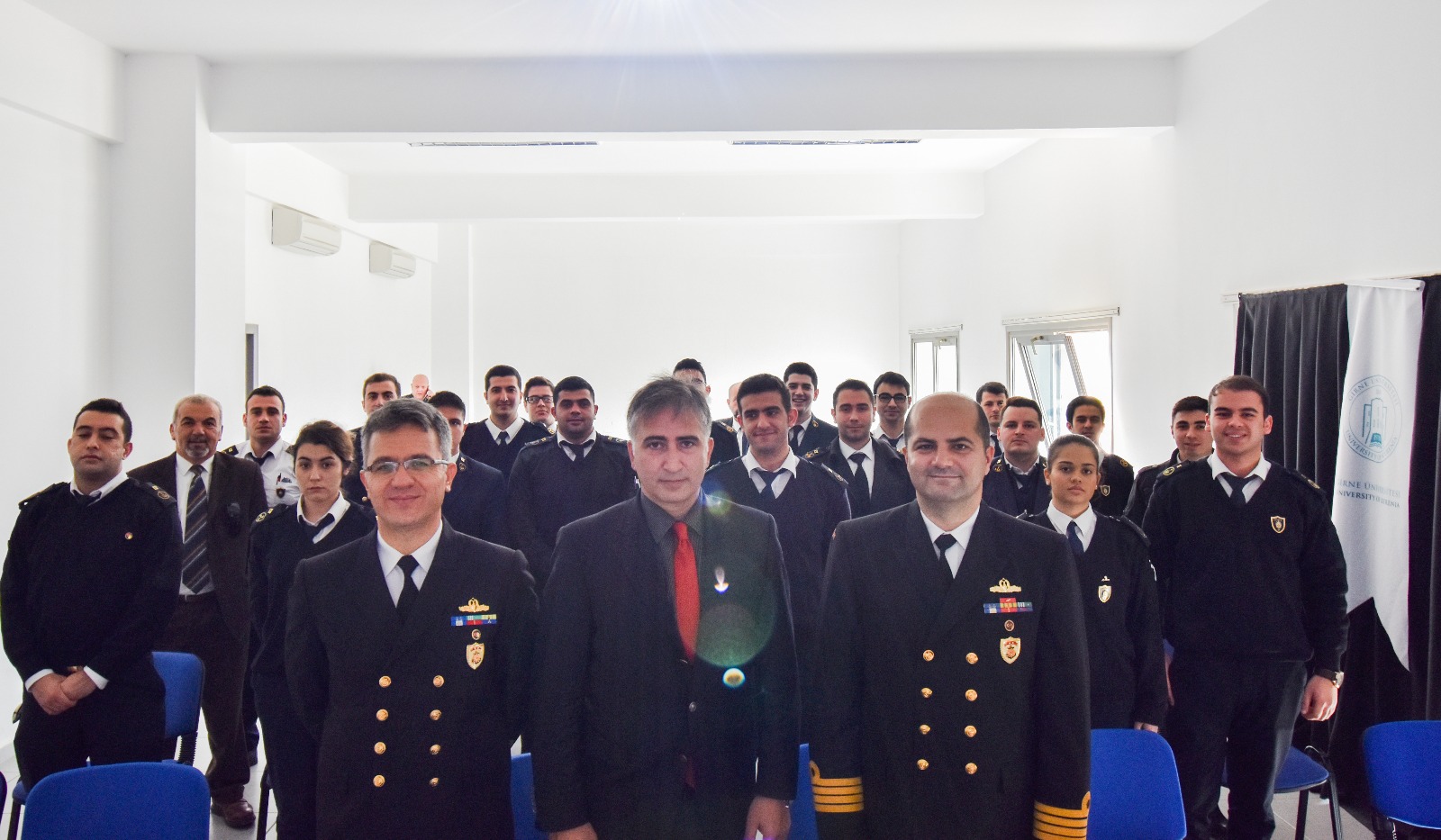 Denizcilik Fakültesi Dekan Vekili Doç. Dr. M. Fatih Hüseyinoğlu ve akademisyenlerin de katıldığı etkinlikte Albay Tarkan Düzgünçınar Sahil Güvenlik Komutanlığı’nın teşkilat ve kuruluş yapısının yanı sıra görev alanları hakkında bilgiler verdi.