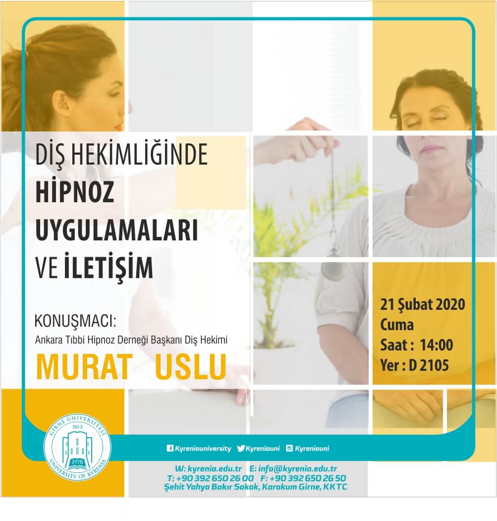 Diş Hekimliği Fakültemizin düzenleyeceği ”Diş Hekimliğinde Hipnoz Uygulamaları ve İletişim Sempozyumu” Ankara Tıbbi Hipnoz Derneği Başkanı Dt. Murat Uslu sunumuyla üniversitemiz kampüsünde 21 Şubat 2020 tarihinde 14:00’da D2105 amfisinde yapılacaktır.
