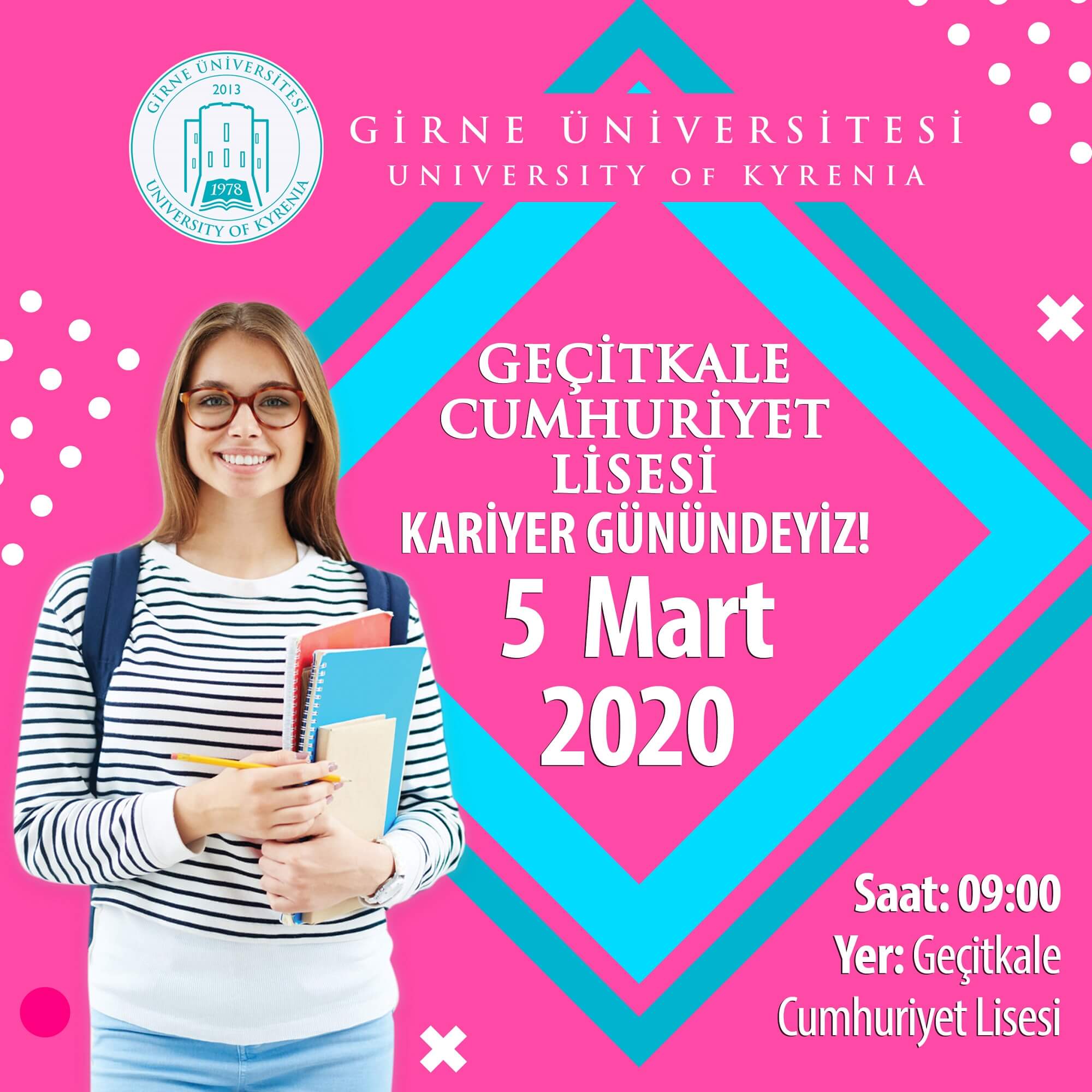 Eklenme Tarihi: 03 Mart 2020, 09:14 Paylaş: 5 Mart 2020 Perşembe günü Geçitkale Cumhuriyet Lisesine geliyoruz. Girne Üniversitesi 2020-2021 Öğrenci Yerleştirme ve Burs Sıralama Sınavı ile ilgili tüm sorularınızı yanıtlamak için saat 10:00’dan itibaren hazır olacağız.