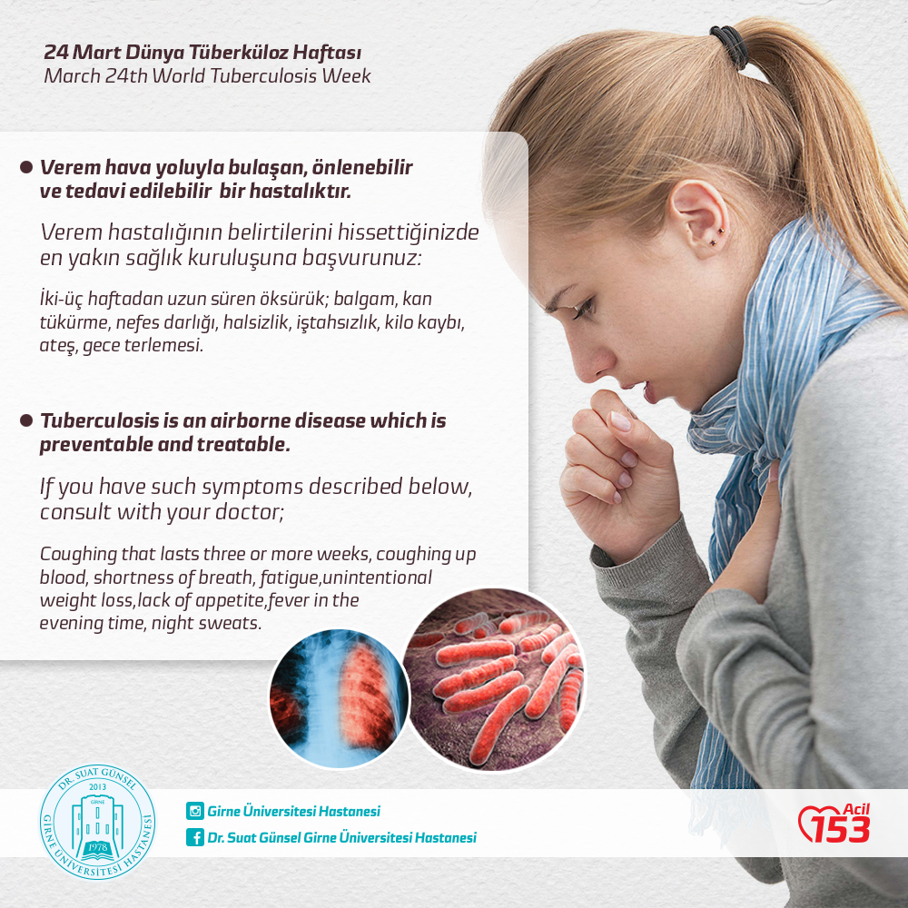 Yıldız hastalığın belirtileri ile ilgili olarak ise açıklamasında şunları kaydetti: “Tüberküloz en sık akciğerlerde görüldüğü için hastalar genellikle 2-3 haftadan uzun süren öksürük, balgam çıkarma, balgamda kan görülmesi yakınmaları ile başvururlar. Bunların yanında halsizlik, gece terlemeleri, iştahsızlık ve kilo kaybı da görülebilir. Verem akciğer dışında başka organlarda da görülebilir. Bu durumda hastaların o organ ile ilgili boyun veya koltuk altında bezelerin şişmesi, idrarda kan görülmesi gibi şikayetleri olabilir. Hastalığın erken tanısı önemlidir. Bu nedenle özellikle uzun süren öksürük ve balgam çıkarma şikayetleri olan hastaların Göğüs Hastalıkları hekimlerine başvurmaları gerekir.”