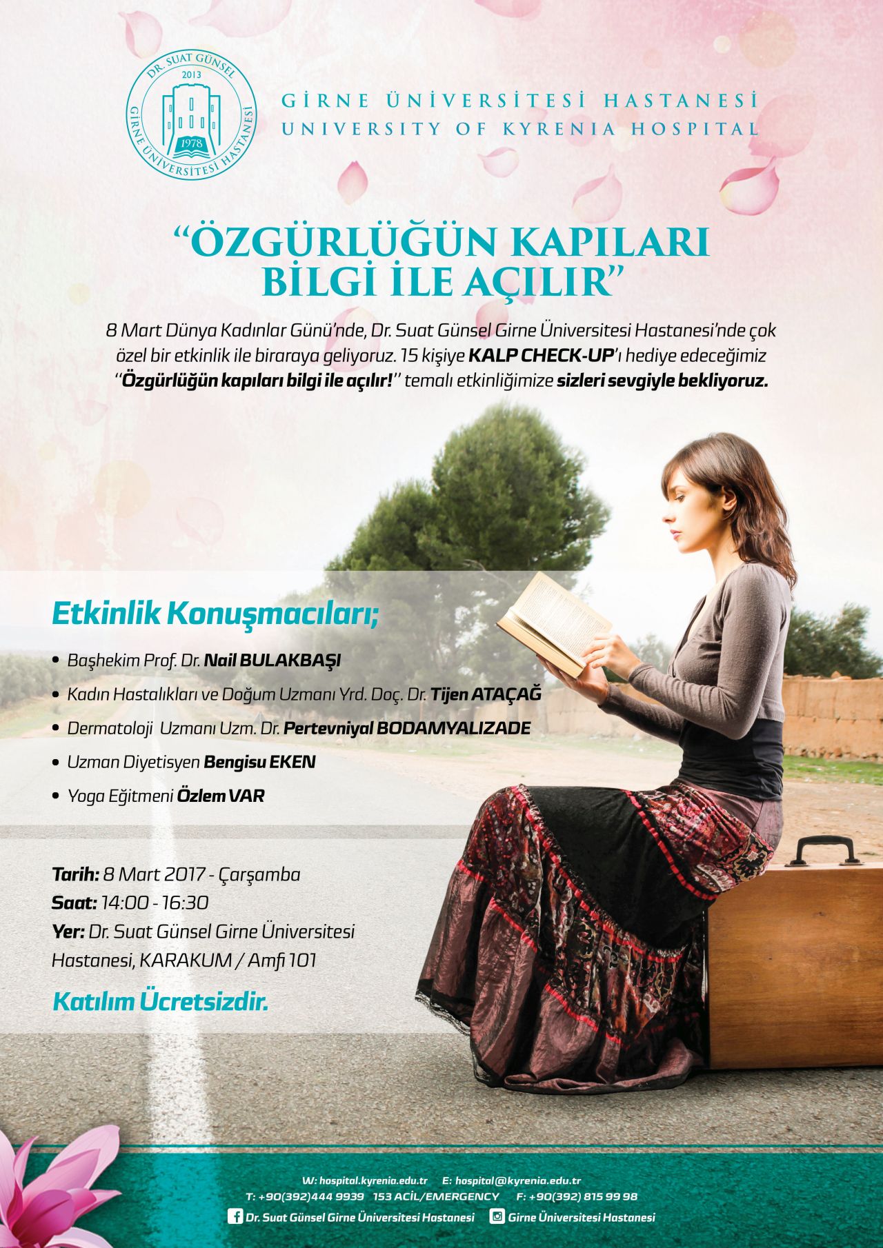 Uzman doktorlar tarafından kadın sağlığı, cilt sağlığı ve doğru beslenme üzerine değerli bilgilerin paylaşılacağı, yoga eğitmeni tarafından bedensel , zihinsel ve duygusal stresle baş etmeye yönelik pratik ve eğlenceli egzersizlerin yapılacağı etkinlikte bir de çekiliş yer alacak. Çekilişte katılımcılardan 15 kişi Dr. Suat Günsel Girne Üniversitesi Hastanesi’nde Kalp Check-up’ı hediyesi kazanacak.Etkinlikte müzik dinletisi eşliğinde kokteyl de düzenleneceği ve kadının kendini önemsemesi, sağlığının değerinin farkına varması, iş yaşamındaki ve toplumdaki yerini, önemini ve değerini farketmesine yönelik konuşmaların yer alacağı “Özgürlüğün Kapıları Bilgi ile Açılır” temalı halka açık olan etkinliğe konuşmacı olarak Girne Üniversitesi Hastanesi Kadın Hastalıkları ve Doğum Uzmanı Yrd. Doç. Dr. Tijen ATAÇAĞ, Dermatoloji Uzmanı Uzm. Dr. Pertevniyal BODAMYALIZADE, Uzman Diyetisyen Bengisu EKEN ve Yoga Eğitmeni Özlem VAR katılacak.