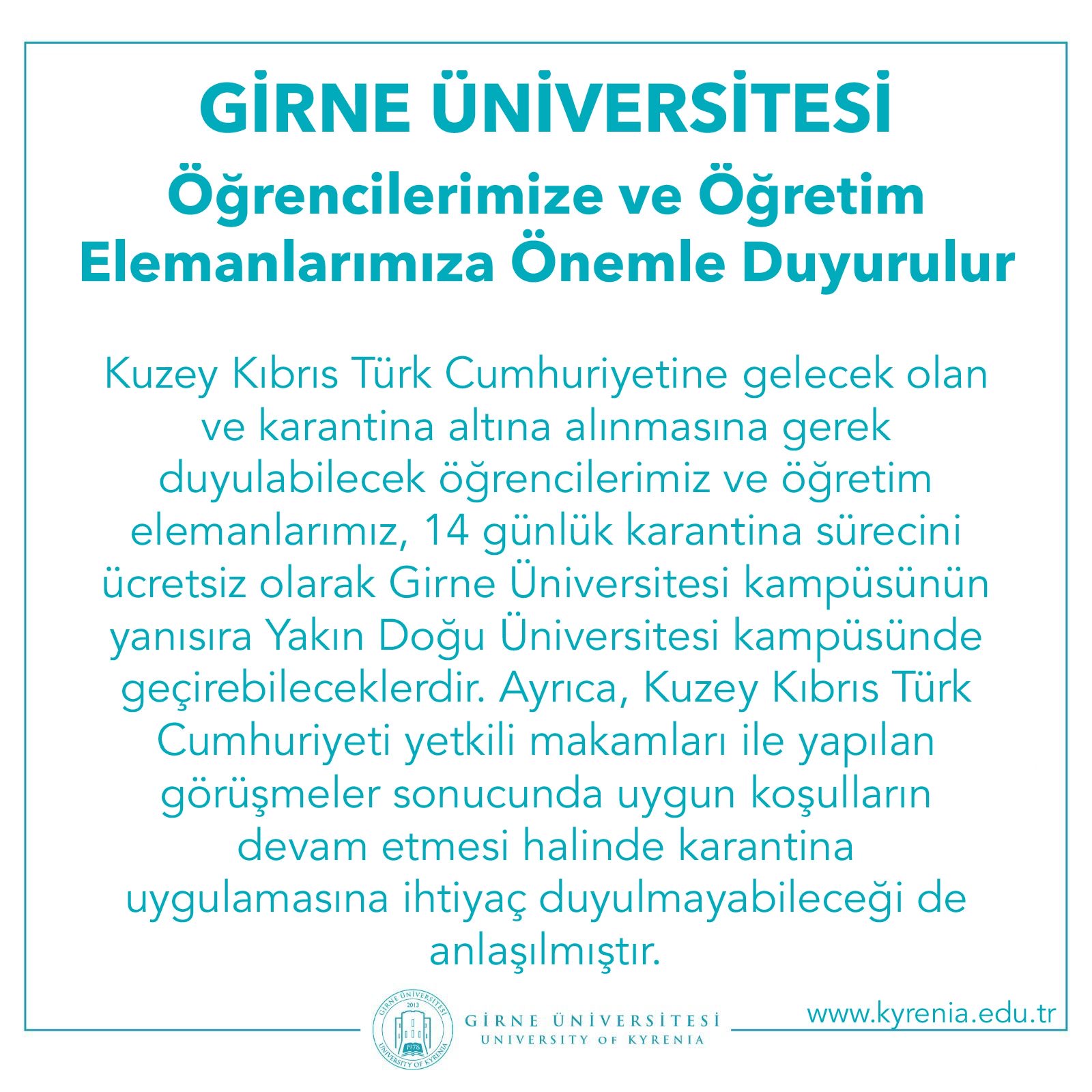 Kuzey Kıbrıs Türk Cumhuriyetine gelecek olan ve karantina altına alınmasına gerek duyulabilecek öğrencilerimiz ve öğretim elemanlarımız, 14 günlük karantina sürecini ücretsiz olarak Girne Üniversitesi kampüsünün yanısıra Yakın Doğu Üniversitesi kampüsünde geçirebileceklerdir. Ayrıca, Kuzey Kıbrıs Türk Cummhuriyeti yetkili makamları ile yapılan görüşmeler sonucunda uygun koşulların devam etmesi halinde karantina uygulmasına ihtiyaç duyulmayabileceği de anlaşılmıştır.