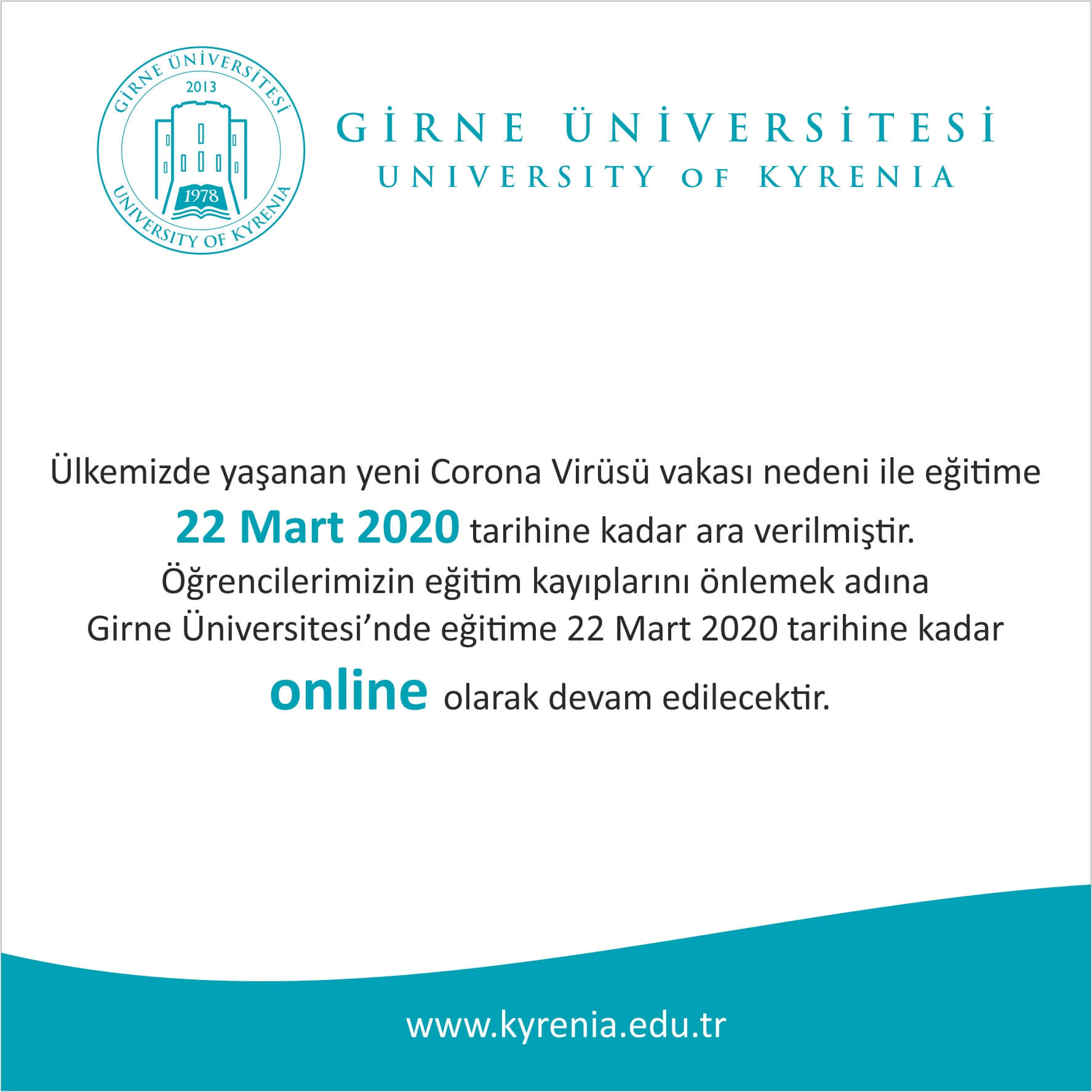 Girne Üniversitesi, Bakanlar Kurulunun eğitime 22 Mart 2020 tarihine kadar ara verilmesi kararı üzerine eğitimi uzaktan eğitimle (online) sürdürecektir. Bu çerçevede, öğrencilerimizin mağdur olmamaları için, Girne Üniversitesinde eğitimler uzaktan eğitim sistemi ile ara vermeden devam edecektir. Moodle ve Edmodo sistemleri üzerinden yürütülecek eğitimlerde, öğrencilerin sisteme kayıt yaparak giriş yapması gerekmektedir. Öğretim Elemanları, kendi dersleriyle ilgili erişim bilgilerini, Üniversitemiz tarafından her öğrenciye ayrı ayrı verilen e-posta (email) adreslerine gönderecektir. Bu nedenle öğrencilerimizin kendilerine ait e-posta (email) adreslerini sık sık kontrol etmesi gerekmektedir.