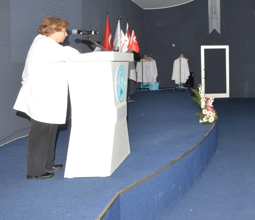 Doktor adaylarının rengiyle saflığı temsil eden beyaz önlüklerini ustalarının elinden giyeceğini söyleyen Girne Üniversitesi Tıp Fakültesi Dekanı Prof. Dr. Rüveyde Bundak, öğrencilerin ileride ayrım gözetmeksizin hastaları için çaba göstereceğine kuşku duymadığını ifade etti.