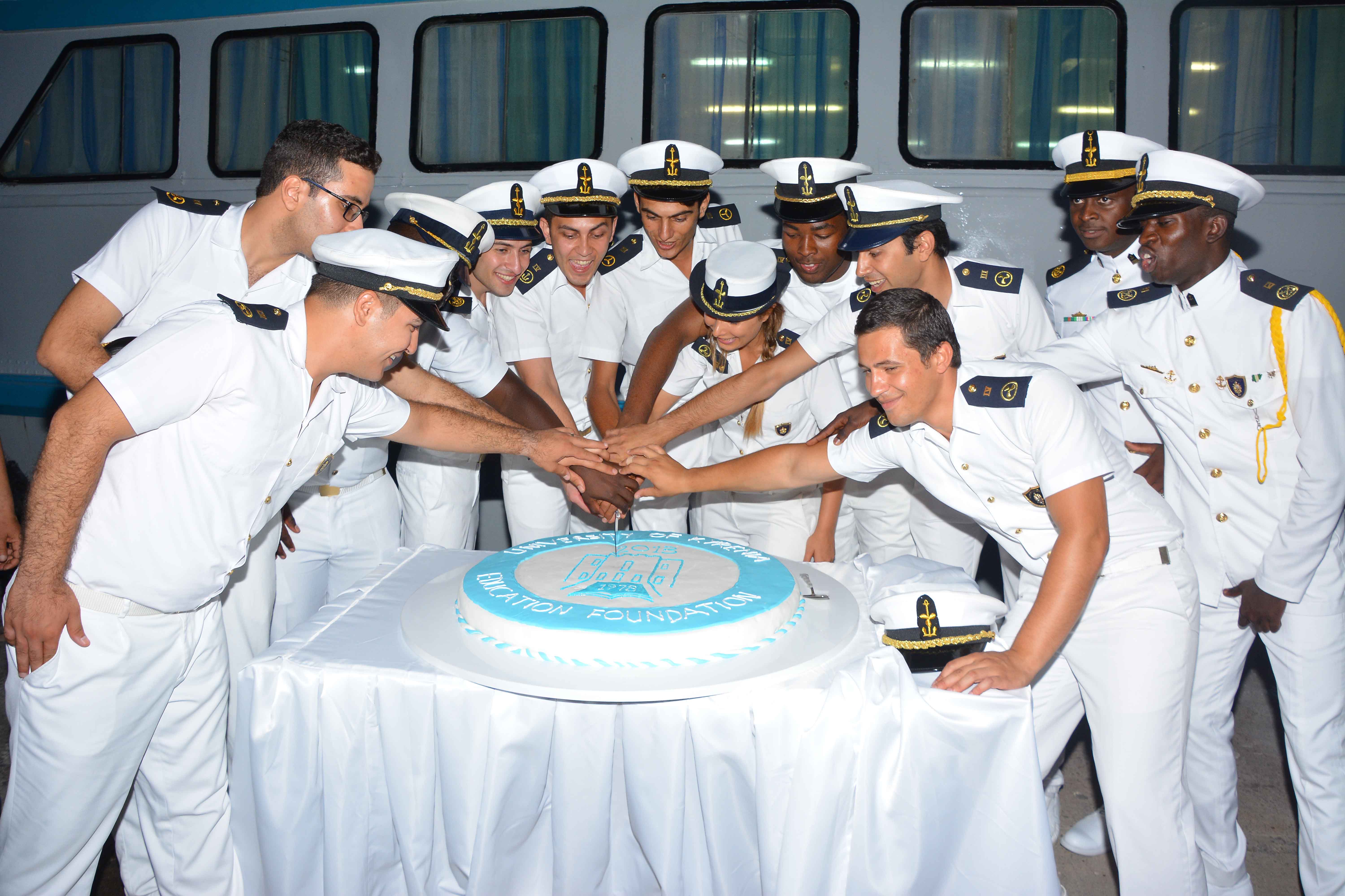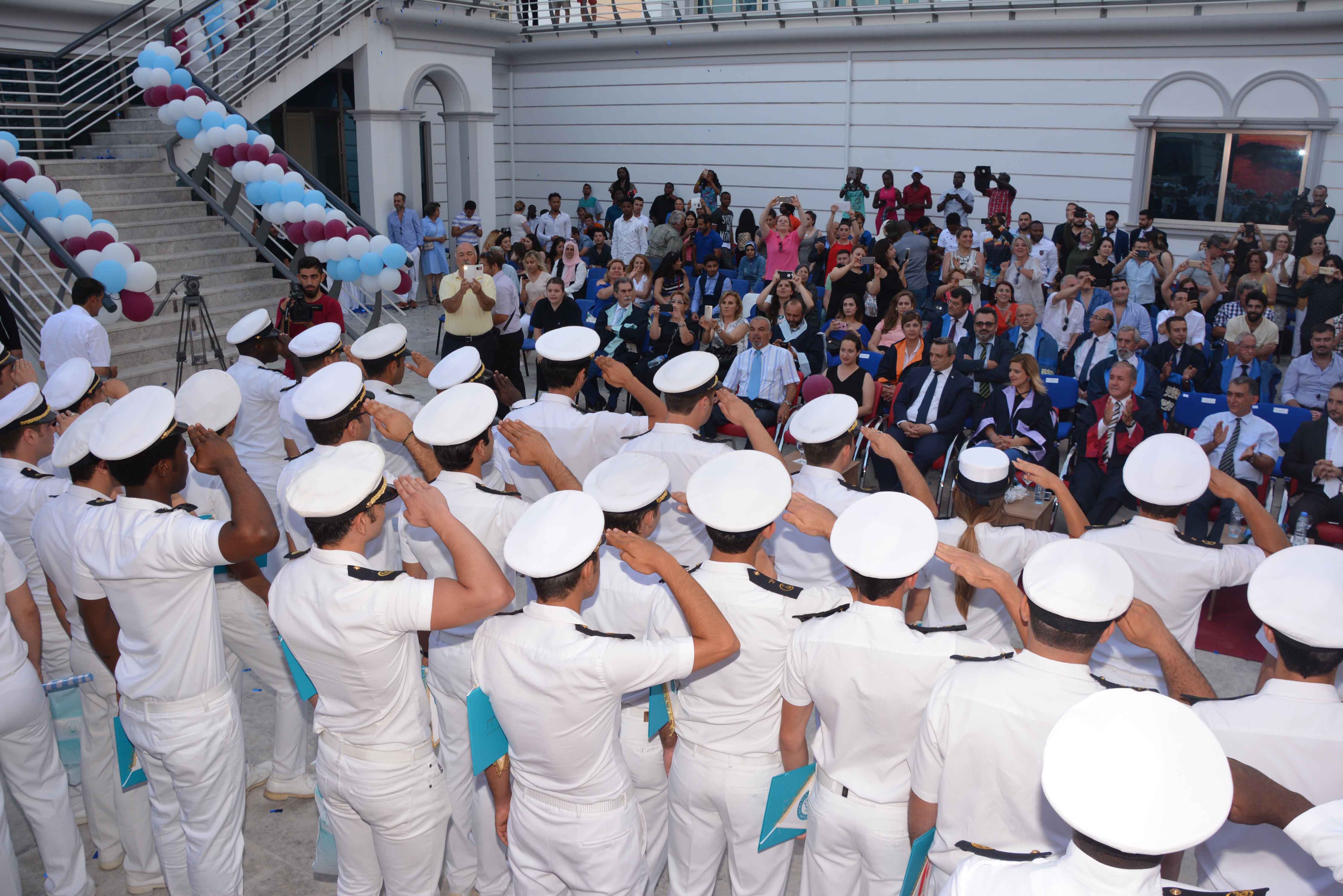 The second part of the ceremony took place at the New Port of Kyrenia where the research and training ship TEAL is berthed, due to the fact that all the graduates of 2016 – 2017 spring term are from maritime programs of the University. The Graduation Ceremony continued under a great atmosphere with the traditional naval salute of ‘Chima Vira’, fast-breaking meal service, cutting the graduation cake and coming to an end after a ritual plunge of graduated students into the sea.