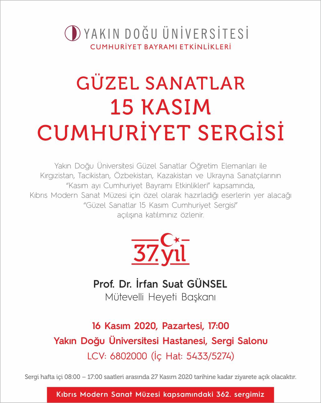Yakın Doğu Üniversitesi Güzel Sanatlar ve Tasarım Fakültesi Dekan Yardımcısı ve Günsel Sanat Müzesi Müdürü Doç. Dr. Erdoğan Ergün küratörlüğünde gerçekleştirilecek olan “Güzel Sanatlar 15 Kasım Cumhuriyet Sergisi”, Yakın Doğu Üniversitesi ve Türk Dünyası’ndan ödüllü 28 sanatçının resim, heykel, seramik ve baskı resimlerinden oluşan 70 esere ev sahipliği yapacak. 16 Kasım 2020 tarihinde saat 17:00’da açılacak olan sergi, ay sonuna kadar ziyaret edilebilecek.