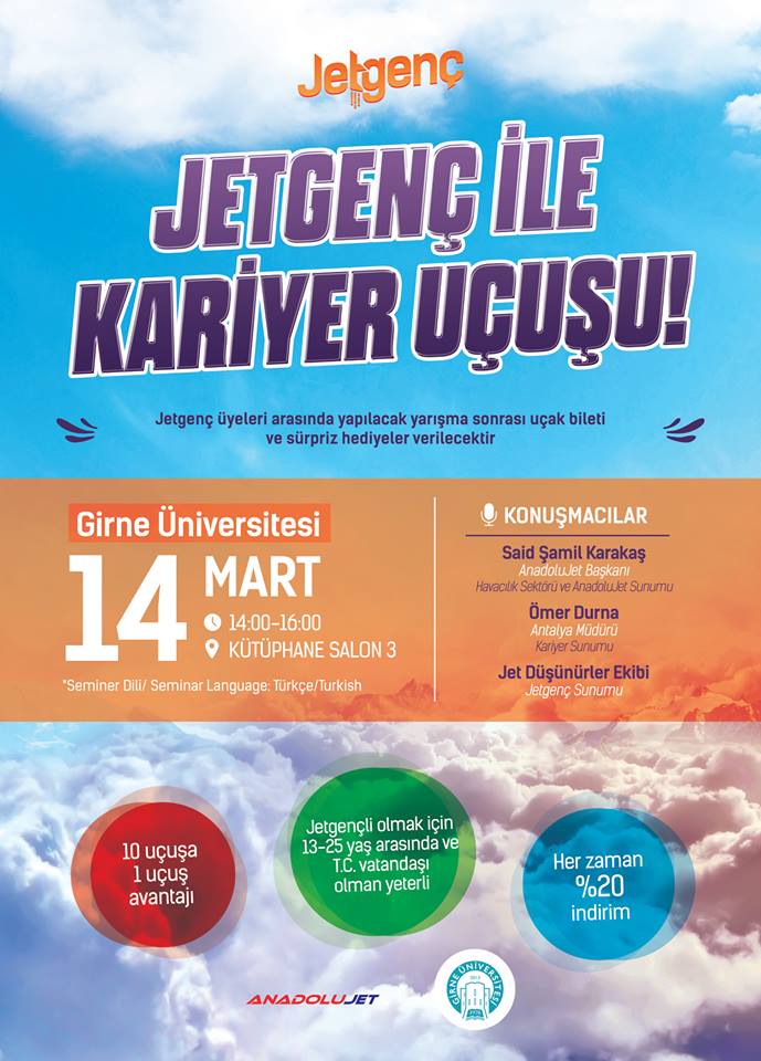 Anadolu Jet`in katkılarıyla düzenlenen “JetGenç ile Kariyer Uçuşu” seminerimize tüm akademik, idari kadromuz ve öğrencilerimiz davetlidir. Seminerimiz 14 Mart Salı günü saat 14:00`da Yakın Doğu Üniversitesi Kütüphane Salon 3’te gerçekleştirilecektir, seminer süresince JetGenç üyeleri arasında yapılacak yarışma sonrası uçak bileti ve süpriz hediyeler verilecektir.
