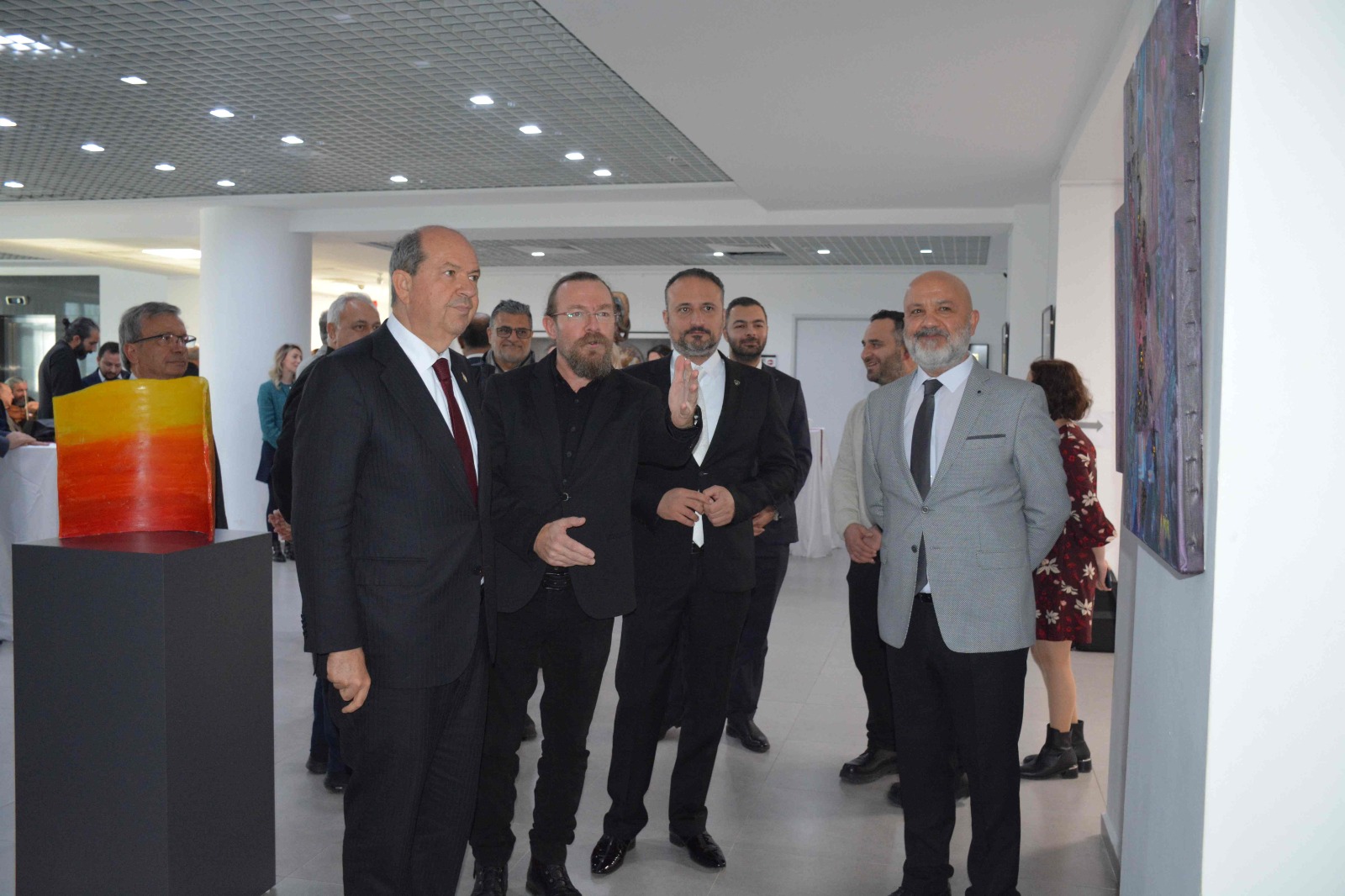 Serginin açılış konuşmasını; Cumhurbaşkanı Ersin Tatar, Yakın Doğu Üniversitesi Rektörü Prof. Dr. Tamer Şanlıdağ ve Yakın Doğu Üniversitesi Güzel Sanatlar ve Tasarım Fakültesi Plastik Sanatlar bölümü öğretim üyesi Dr. Vedia Okutan Gaydeler gerçekleştirdi.