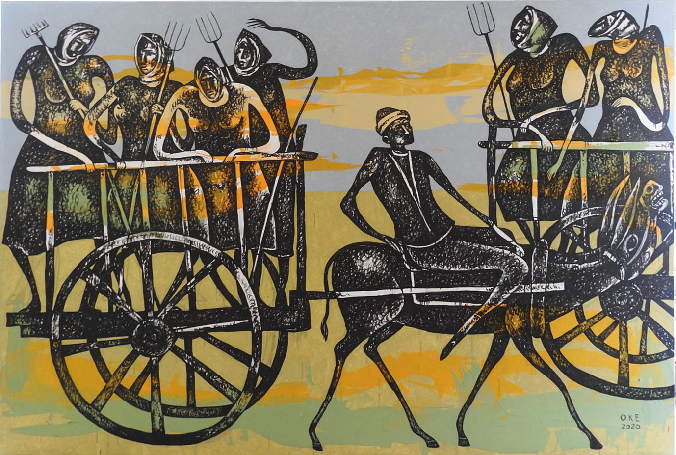Orazbek Yesenbayev, “Her Zaman Mutluluk Olsun” adlı kişisel sergisinde sergilenecek “Hasat” adlı çalışmasında, kırsal yaşamda, kadınların bir araya gelerek olgunlaşmış hasadı toplamalarını anlatıyor.