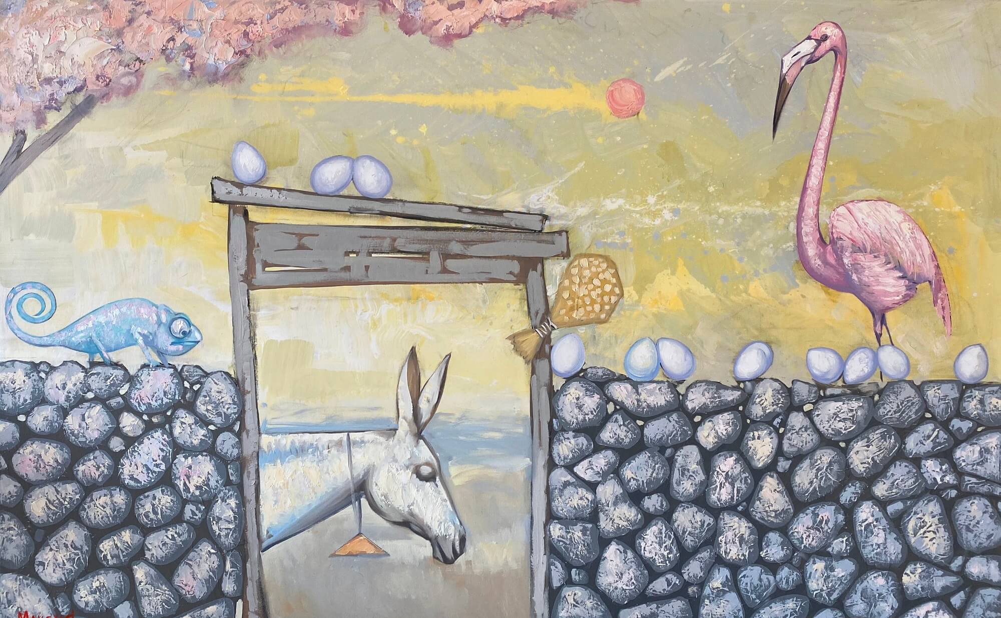 “Kıbrıs’ta Bir Yerde” adlı çalışmasında sanatçı, Kıbrıs’ta insanın içini ısıtan ve doğasında olağanüstü güzellikleri barındıran unutulmaz bir yer olarak anılarına adanmış olan Karpaz yarımadası’nı resmetmiştir. Resmin sol tarafında bir eşek ve bir bukalemun’u tasvir etmiştir. Yabani eşeklerin görüldüğü Kıbrıs’ın en etkileyici yerlerinden biri olan Karpaz Yarımadası’nı ziyaret eden sanatçı, bu alandan çok ilham almış ve ardından yeni bir eser yaratmıştır. Resimde bir eşek ve bir leylek kombinasyonu tasvir edilmiştir. Sanatçıya göre, leylek yeni bir yaşam sembolize etmektedir.