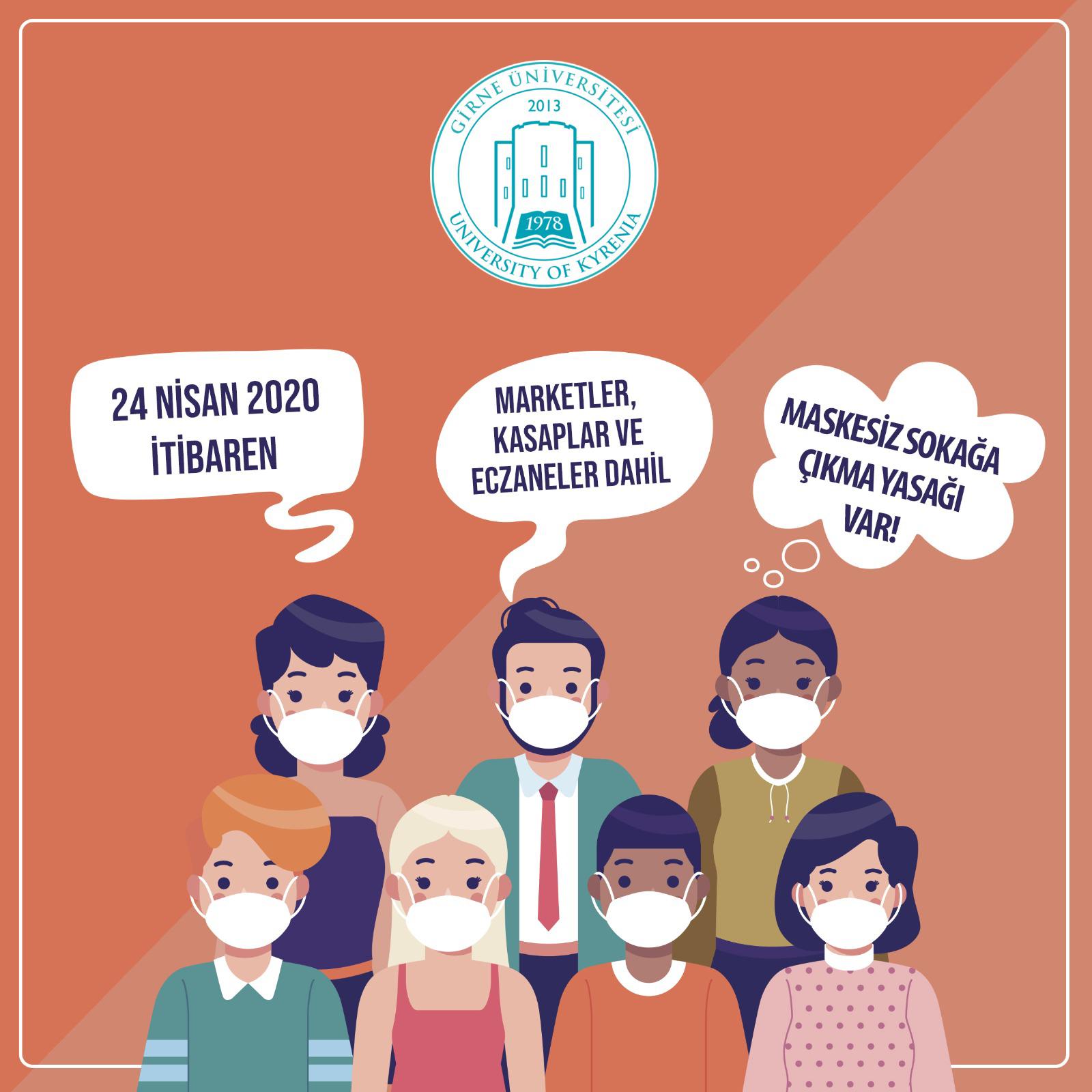 Eklenme Tarihi: 24 Nisan 2020, 10:52 Paylaş: 22 Nisan 2020 tarihli, KKTC Bakanlar Kurulu kararları doğrultusunda yarından (24 Nisan 2020) itibaren marketler, kasaplar, ve eczaneler dahil MASKESİZ SOKAĞA ÇIKMA YASAĞI kararı alınmıştır.