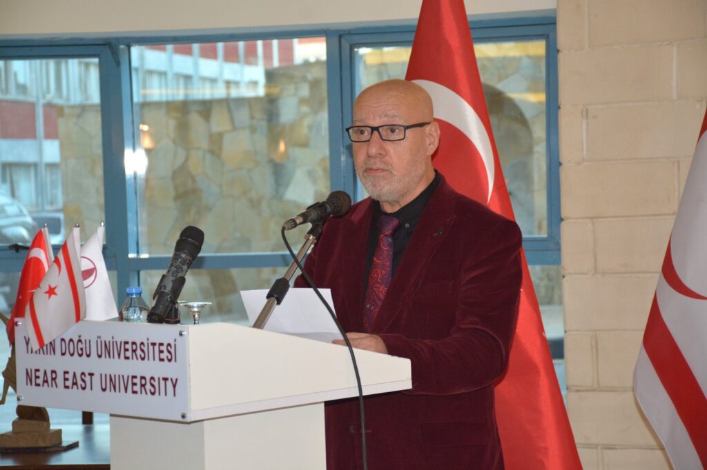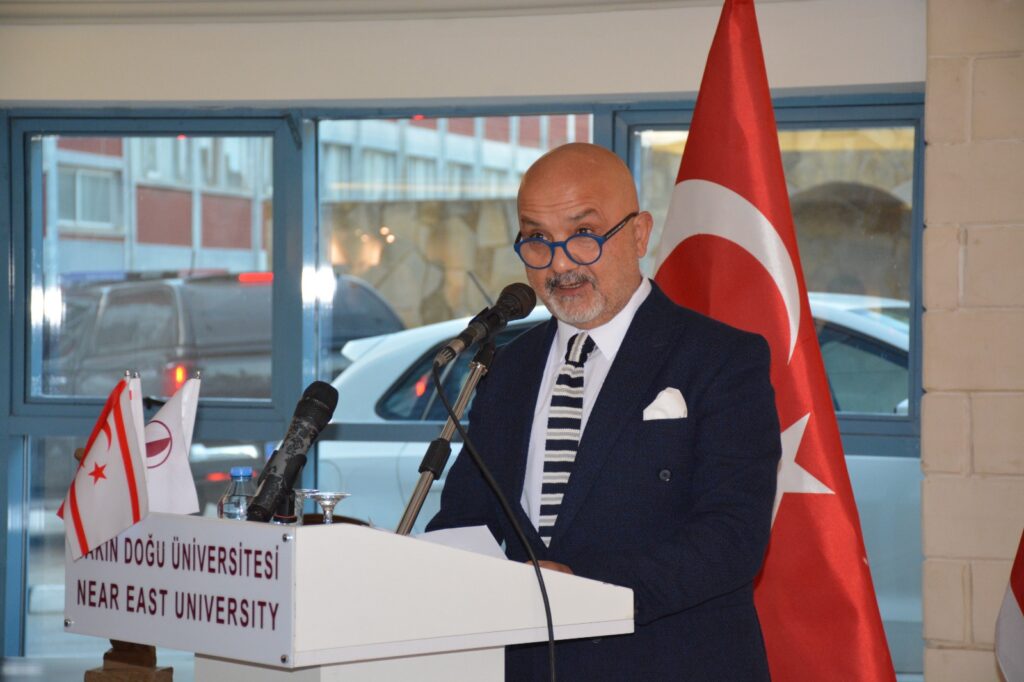 Yakın Doğu Üniversitesi Rektörü Prof. Dr. Tamer Şanlıdağ konuşmasına, “Sanatın farklı disiplinlerinden eserlerle bezenmiş bu özel sergi, yalnızca bir sanat etkinliği olmanın ötesinde, ülkemizin kültürel mirasına olan bağlılığımızın bir nişanesi olarak çok değerlidir” sözleri ile başladı. Cumhurbaşkanı Ersin Tatar’ın yakın zamanda gerçekleştirdiği uluslararası temaslarından ve buralarda yaptığı konuşmlarından da bahseden Prof. Dr. Tamer Şanlıdağ, “Cumhurbaşkanımız Sayın Ersin Tatar’ın, Kırgızistan’da düzenlenen Türk Devletleri Teşkilatı Devlet Başkanları Konseyi’nin 11’inci Zirvesi ile Belçika ve Polonya’daki temaslarında; Yakın Doğu Üniversitesi’nin dünya sıralamalarındaki başarılarını ve ülkemizin yerli otomobili GÜNSEL’in uluslararası arenada kazandığı başarıları vurgulamasını büyük bir gururla takip ettik. Bu vesileyle, kendisine en içten teşekkürlerimizi ve şükranlarımızı sunuyoruz” dedi.