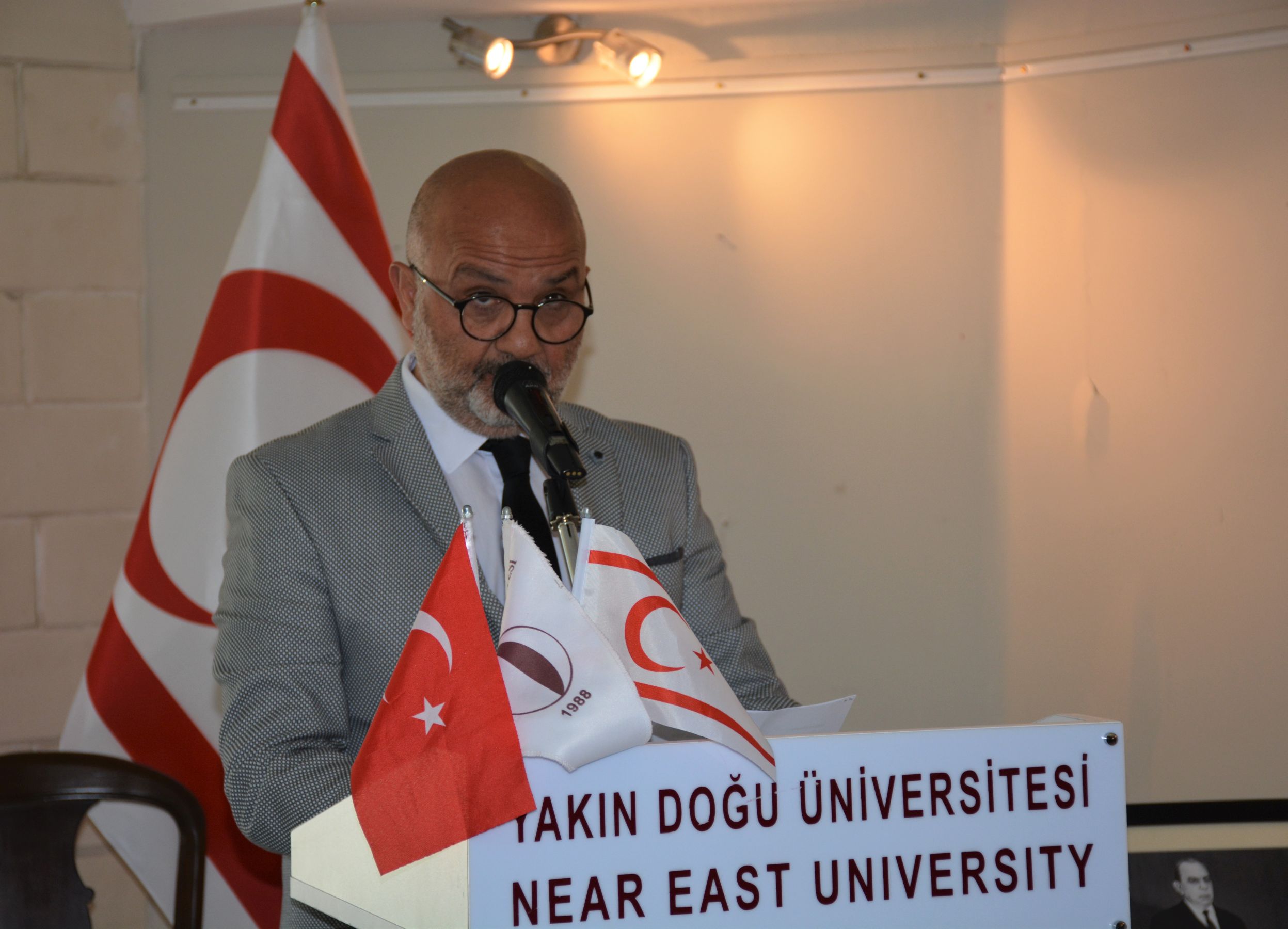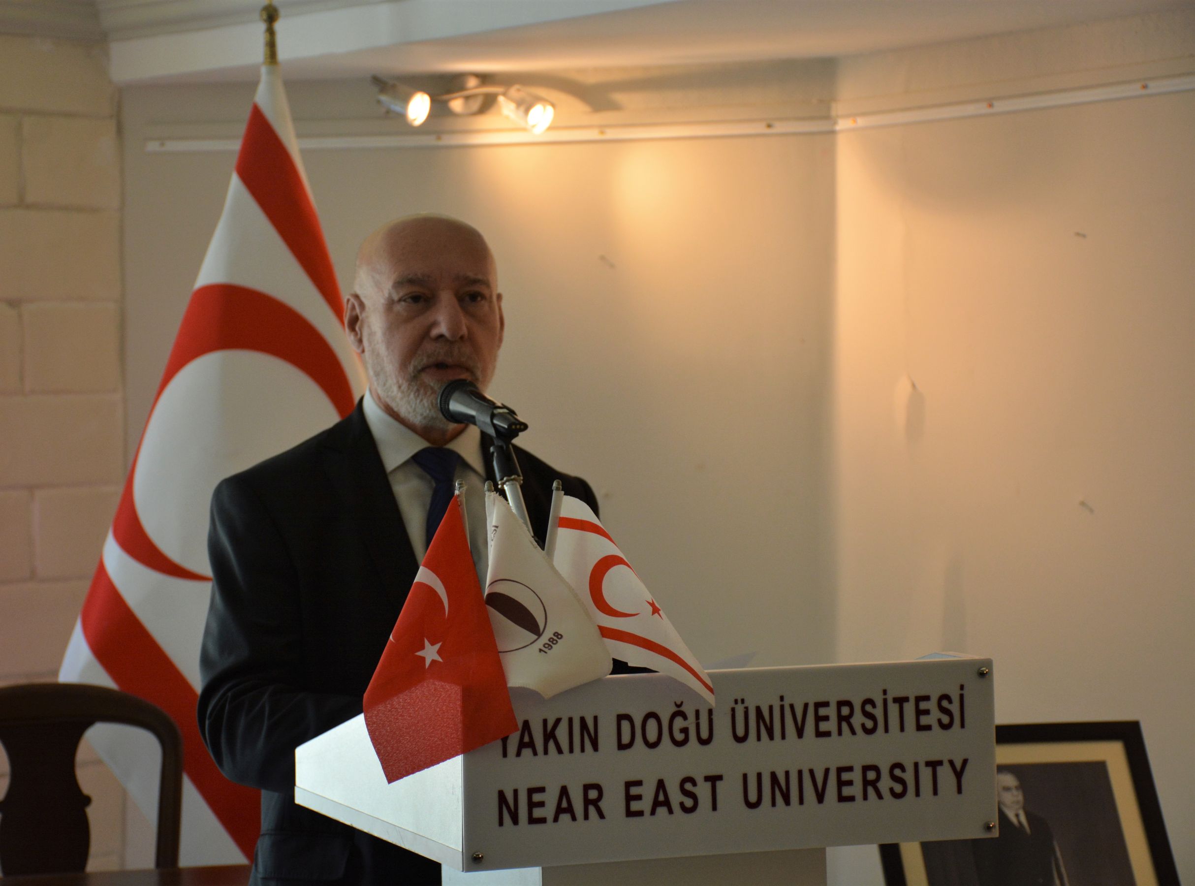 Konuşmasına “Güzel Sanatlar Mart Sergisi”nin ayrı bir önem ve anlam taşıdığını belirterek başlayan Yakın Doğu Üniversitesi Rektörü Prof. Dr. Tamer Şanlıdağ, “Güzel Sanatlar Mart Sergimiz, bugün çok özel bir ana sahne olacak. Sanatçı Mehmet Narin’in, Şampiyon Meleklerimizin anısına adadığı ve bir ayı aşan bir emekle tamamladığı yağlı boya tabloyu bugün, Meleklerimizin aileleriyle birlikte ilk kez seyredeceğiz” dedi.