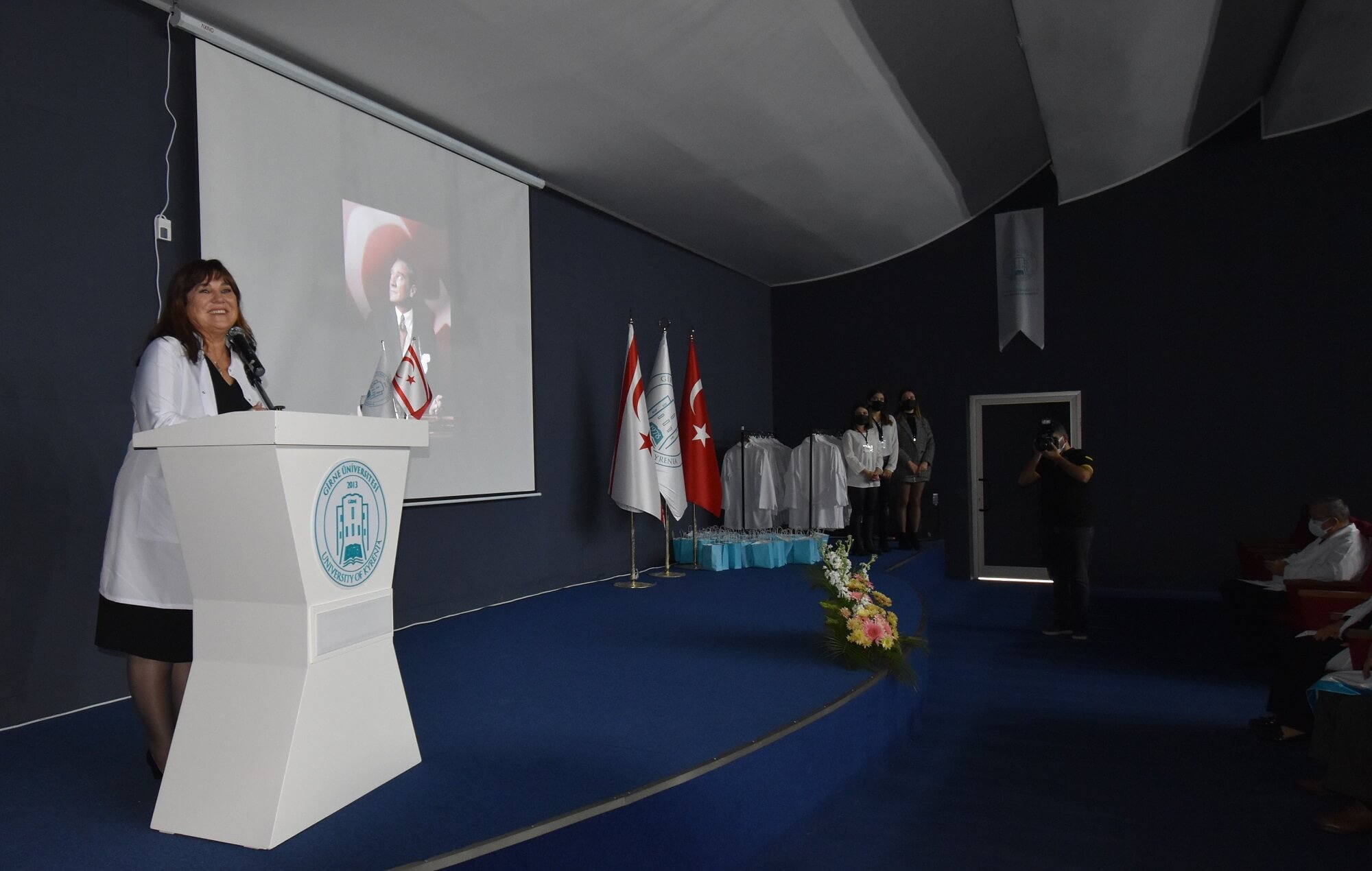 At the ceremony where the future dentists wore their white coats for the first time, University of Kyrenia Rector Prof. Dr. İlkay Salihoğlu and Dean of Faculty of Dentistry Prof. Dr. Serap Çetiner gave speech.