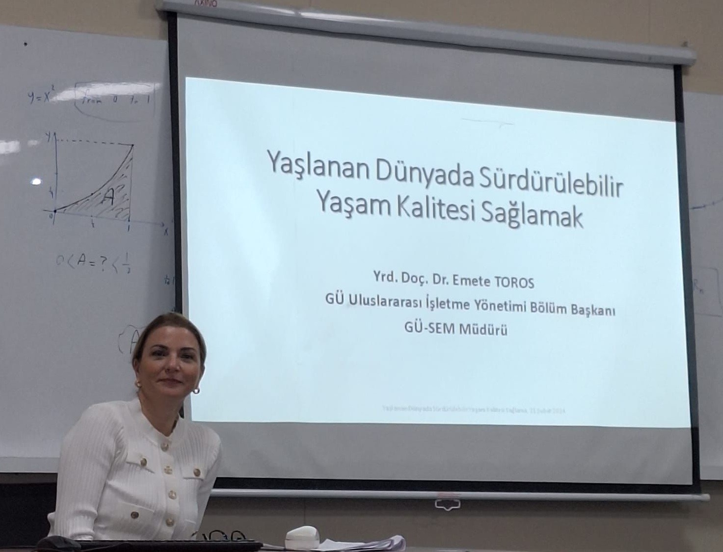 Girne Üniversitesi İktisadi ve İdari Bilimler Fakültesi Uluslararası İşletme Yönetimi Bölüm Başkanı ve GA-SÜM Müdürü Yard. Doç. Dr. Emete Toros’un “Yaşlanan Dünyada Sürdürülebilir Yaşam Kalitesi Sağlamak” başlıklı semineri 21 Şubat Çarşamba günü GÜ Amfi 102’de yapıldı.