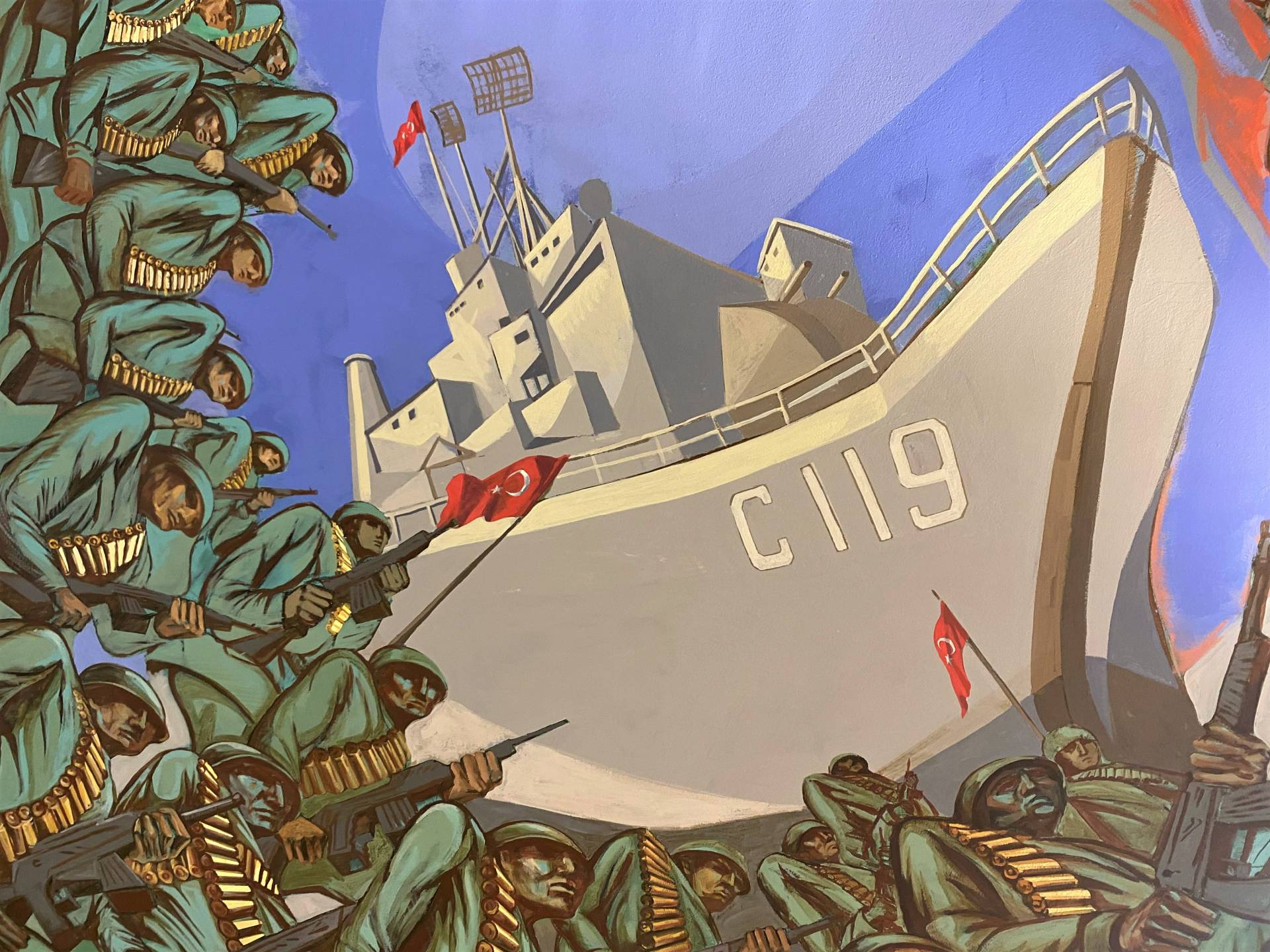 Kıbrıs tarihinde önemli dönüm noktalarından biri olan 20 Temmuz Kıbrıs Barış Harekatı’nın üzerinden 48 yıl geçti. Kuzey Kıbrıs Türk Cumhuriyeti’nin kurulmasıyla nihayetlenen 20 Temmuz ruhu, Surlariçi Şehir Müzesi’nde yaşamaya devam ediyor. Lefkoşa’nın tarihi bölgesi Surlariçi’nde kurulu olan Surlariçi Şehir Müzesi’nin üçüncü ve dördüncü katlarında yer alan tavan resimleri, 48 yıl öncesinin 20 Temmuz’unu ziyaretçilerine yeniden yaşatıyor. Ayrıca müzenin diğer katlarında da Kıbrıs tarihinin farklı dönemlerini resmeden tavan resimleri görenleri büyülüyor.